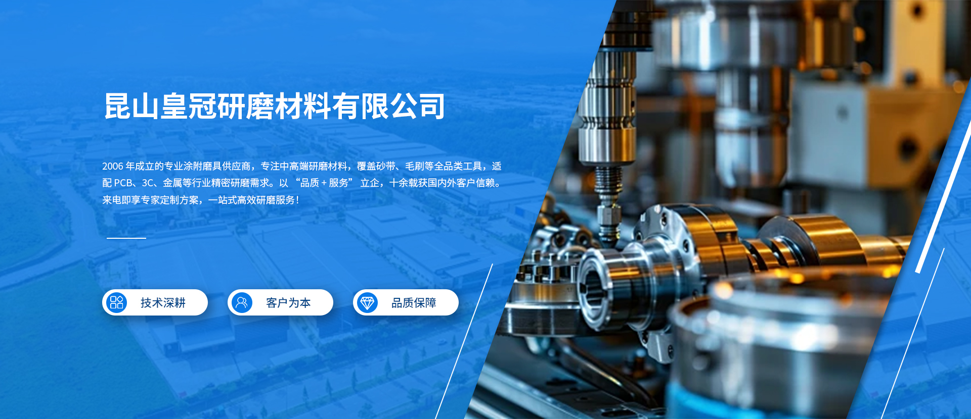 昆山皇冠研磨材料有限公司是一家集生產(chǎn)和銷售于一體的涂附磨具公司,自二零零六年成立以來(lái),一直專注于生產(chǎn)銷售各類型中高端研磨材料。我公司本著質(zhì)量為本,用戶至上的原則,不斷開(kāi)拓進(jìn)取。產(chǎn)品廣泛應(yīng)用于PCB、不銹鋼等行業(yè)的表面處理生產(chǎn)工序中,為各行業(yè)的客戶提供各類創(chuàng)新高效的解決方案。